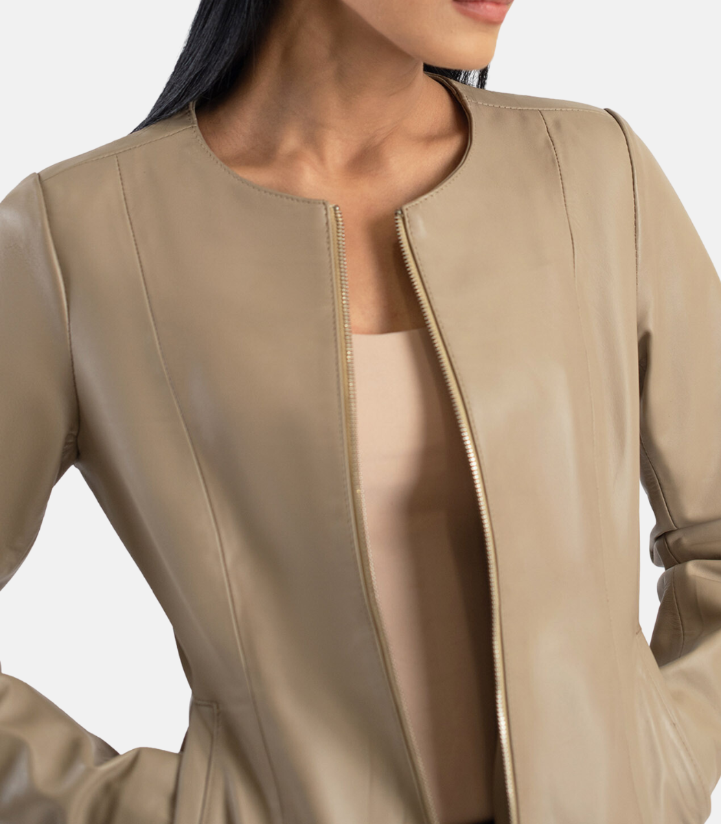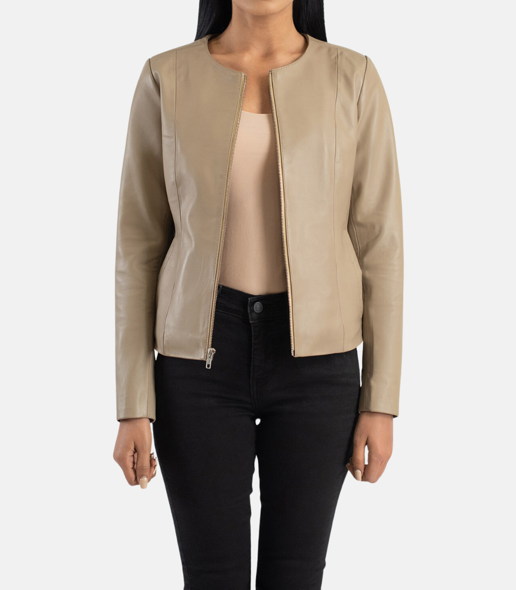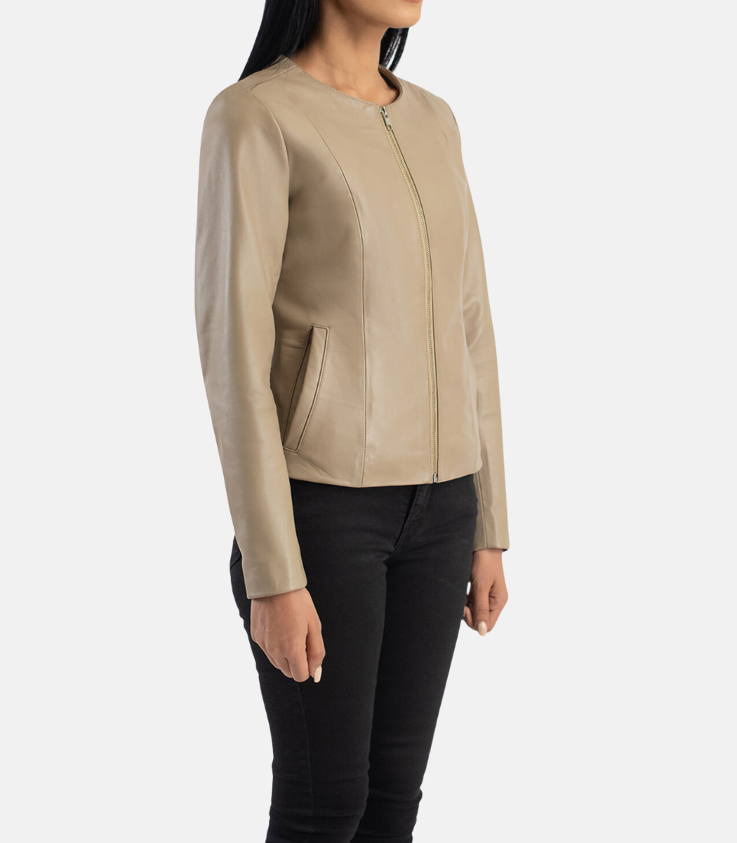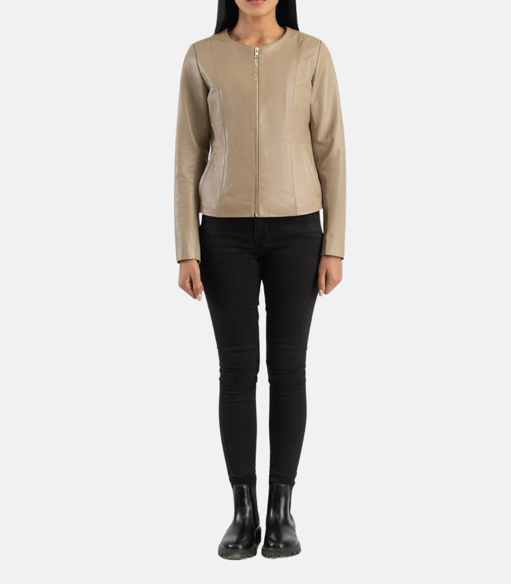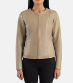 Women’s Beige Leather Jacket With Collarless design