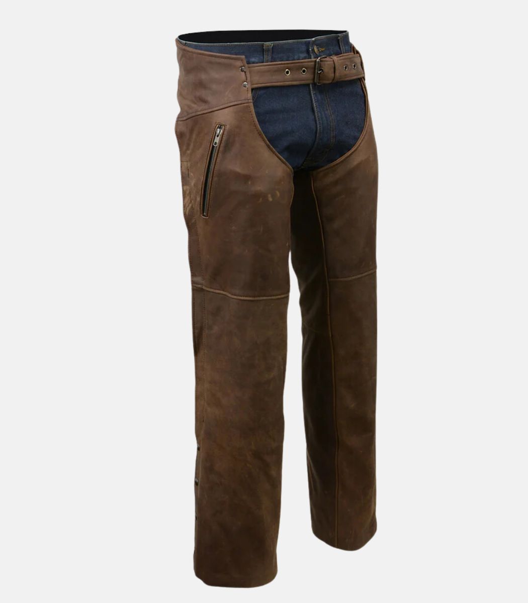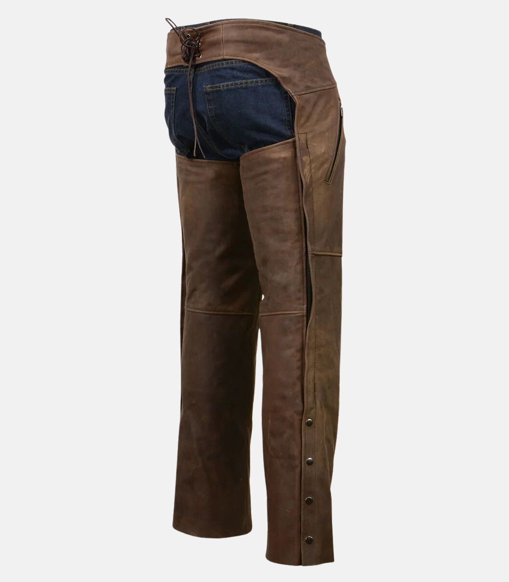 Men’s Classic Brown Leather Chaps with Two Zipper Pockets