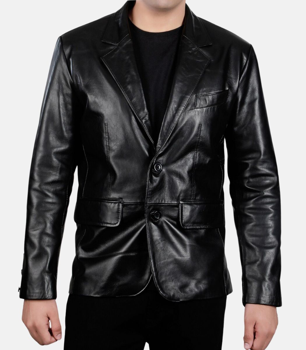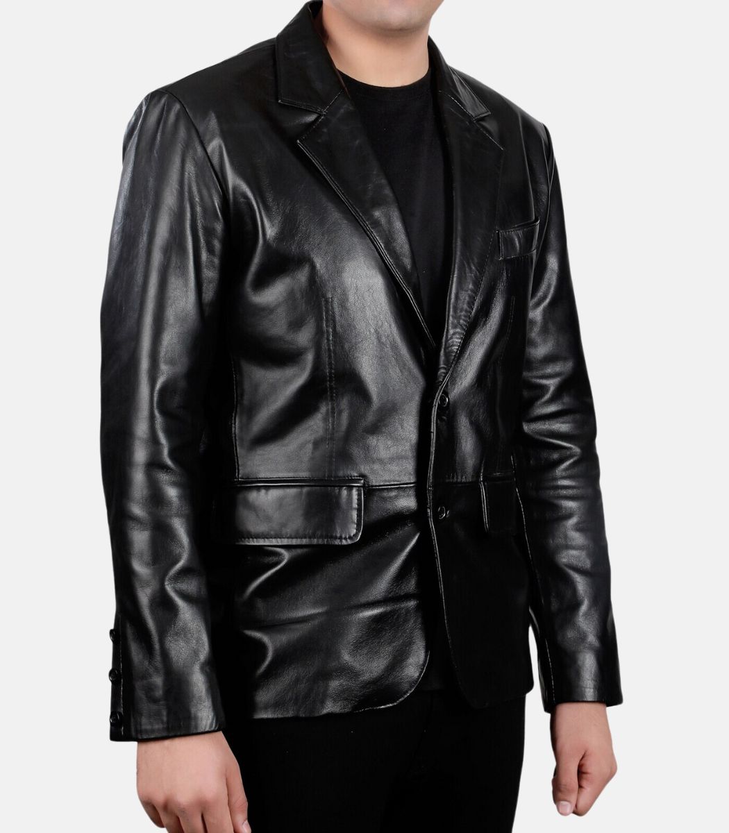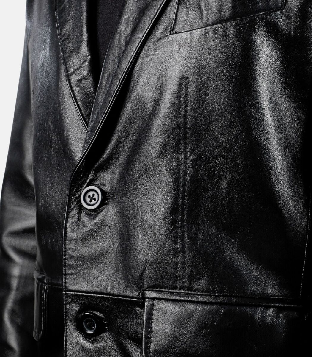 This Men’s Black Lambskin Leather Coat with Flap Pockets epitomizes timeless sophistication. Crafted from premium lambskin, it boasts a sleek two-button single-breasted design, complete with flap pockets for a refined touch. Its minimalist aesthetic ensures an effortlessly elegant look for any occasion.