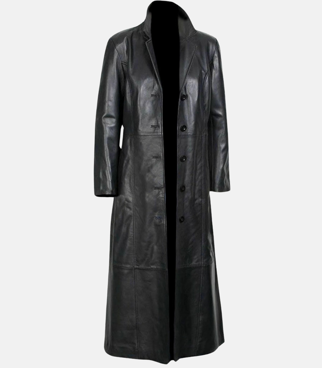 Add a bold, gothic edge to your look with this full-length black trench coat, crafted from premium genuine leather. Its sleek, polished finish, combined with a structured silhouette, creates a perfect blend of sophistication and gothic style, ideal for formal occasions or costume wear.