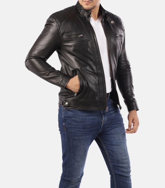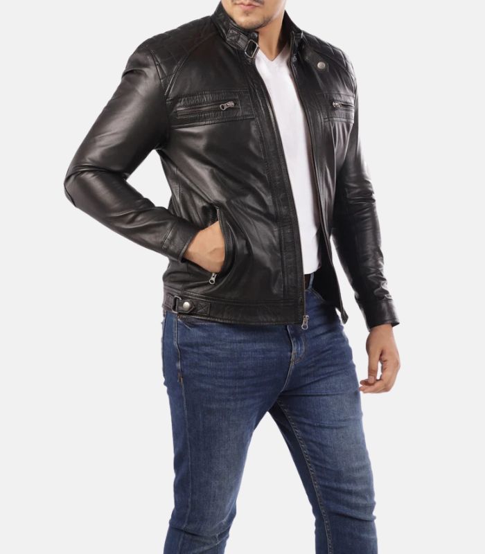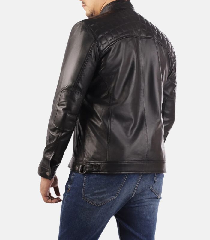Introducing Men’s Black Leather Jacket With Quilted Pattern – our Fine Finish Leather Jacket that seamlessly blends style and functionality. This trendy men’s jacket features a quilted diamond pattern with four zip pockets, cuff sleeves, and a snap tab collar for a finishing touch.