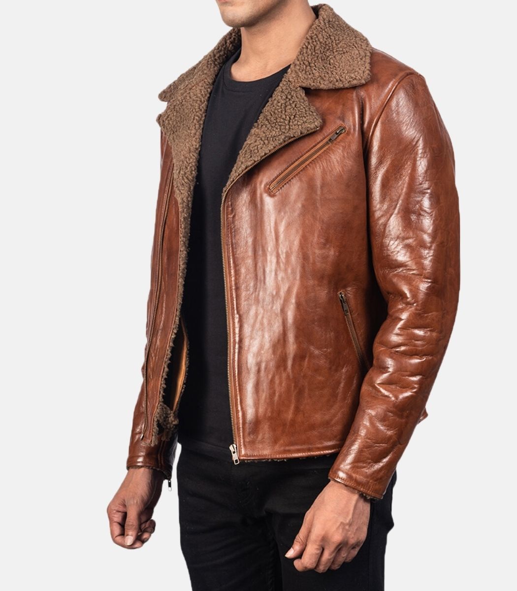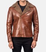 Shearling Brown Leather Jacket For Men With Notch Collar