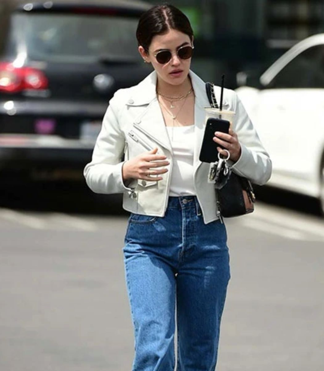 Make a statement with our Lucy Hale Attractive White Leather Jacket, inspired by the one worn by Lucy Hale during Easter in Los Angeles. This chic and timeless piece will elevate your style with its voguish elegance.
